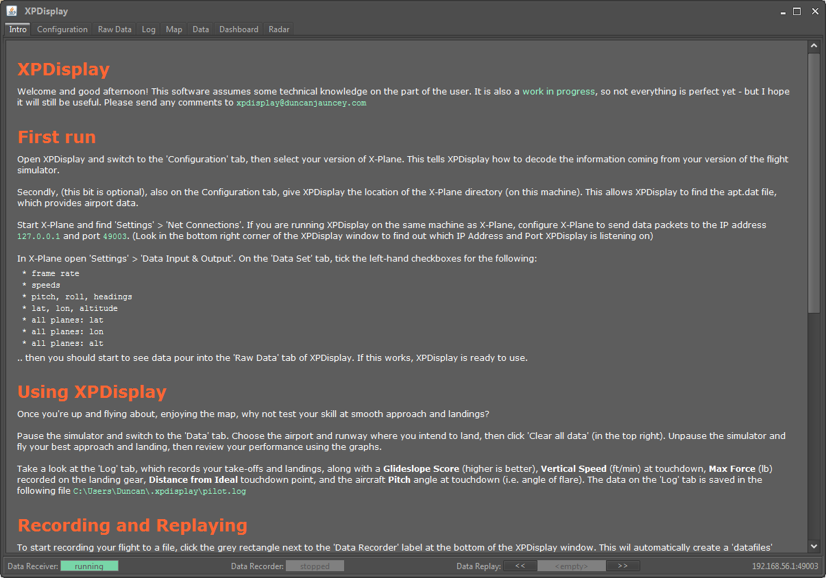 Q: Why don't you implement X?A: That's (probably) a great idea! Before you drop me an email, please check that X-Plane can provide that kind of data via the Data Output screen, and have a good long think about exactly how the feature would work. I might be slow to respond to emails, but I'm open to ideas!