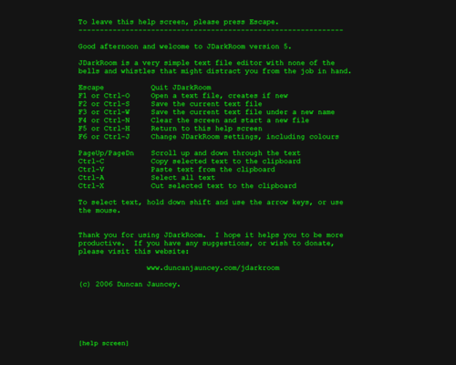 JDarkRoom is a popular, simple full-screen text file editor with none of the usual bells and whistles that might distract you from the job in hand. If you are writing a speech, novel, essay, thesis or just need to be able to concentrate on your writing, then JDarkRoom may help you.