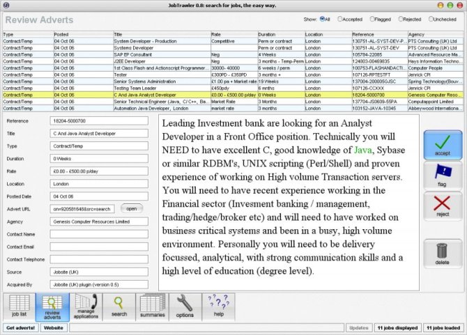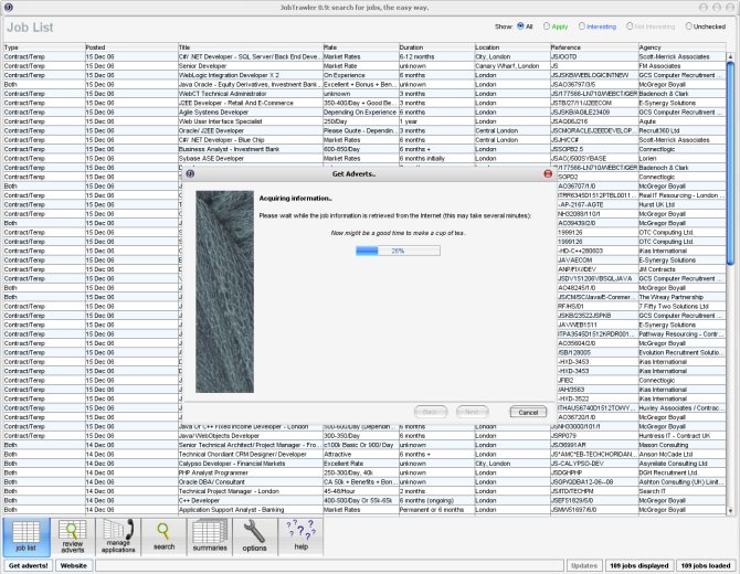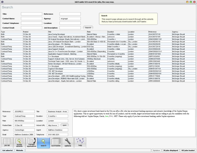 It normally takes a while to browse job websites, click on each interesting advert, wait for it to load, dismiss it, then move on to the next one. JobTrawler downloads all the adverts in one batch, then it allows you to focus on the important bits of each one. It tracks the adverts you've already seen (so you don't waste time tomorrow) and helps you with the application process - leaving you more time to spend networking and talking on the phone to potential leads and recruitment agencies.