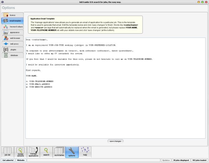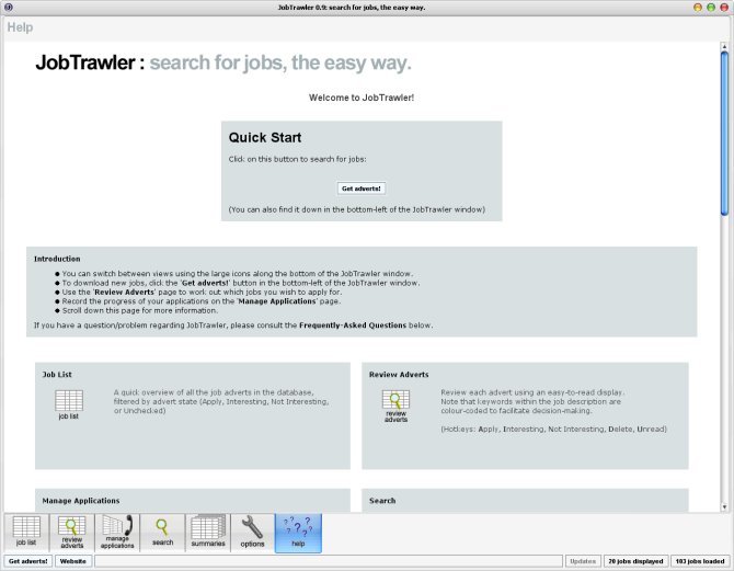 JobTrawler is a desktop application which aggregates job listings from various websites and helps the searcher with the filtering and workflow management of their applications.