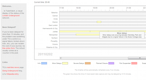 TubeWatch is a visual display of the status of the London Underground network. It presents a clear view of how the status has changed throughout the day and maintains a historical record of previous days.